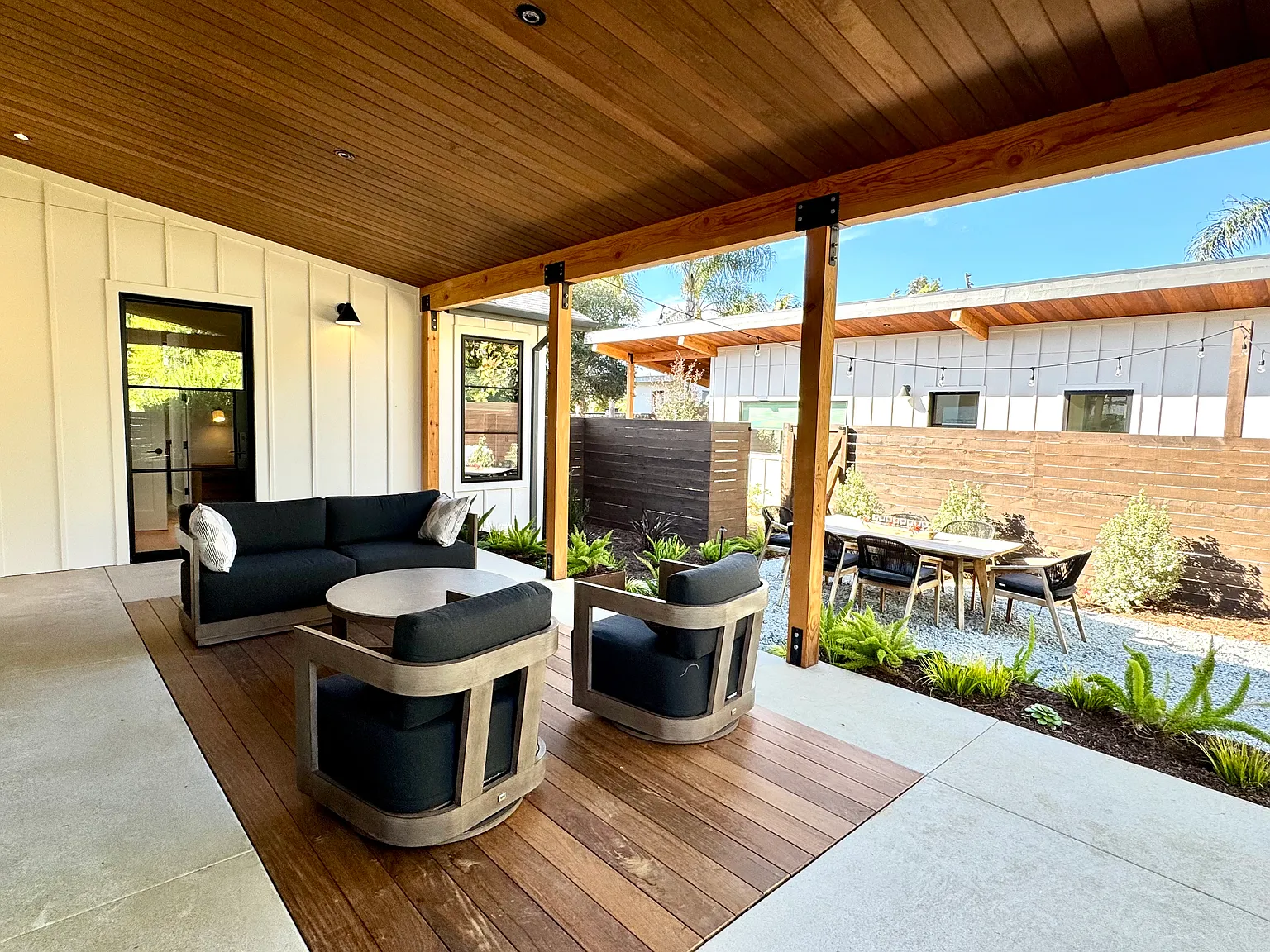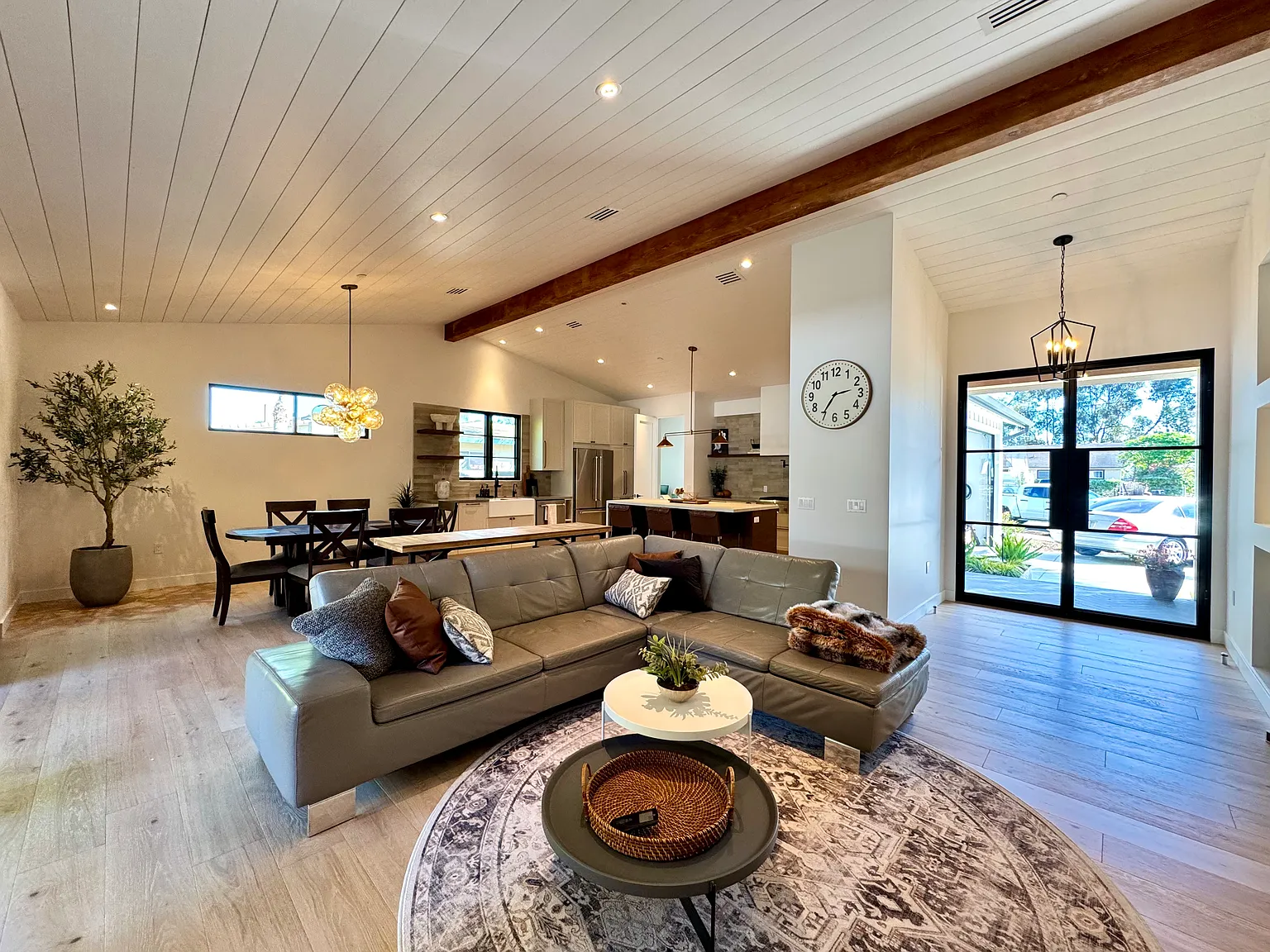 For additional flexibility, the main house may be rented together with the 600sqft guest house in the back. This brand-new 1-bedroom, 1-bath ADU offers high-end finishes, abundant natural light, a luxury kitchen with new appliances, a living area with sleeper sofa, a spa-inspired bathroom with skylight, and a bedroom with wardrobe and stacking washer/dryer. It features its own private entrance and covered patio, plus one driveway parking space with EV charging ideal for extended family or guests.