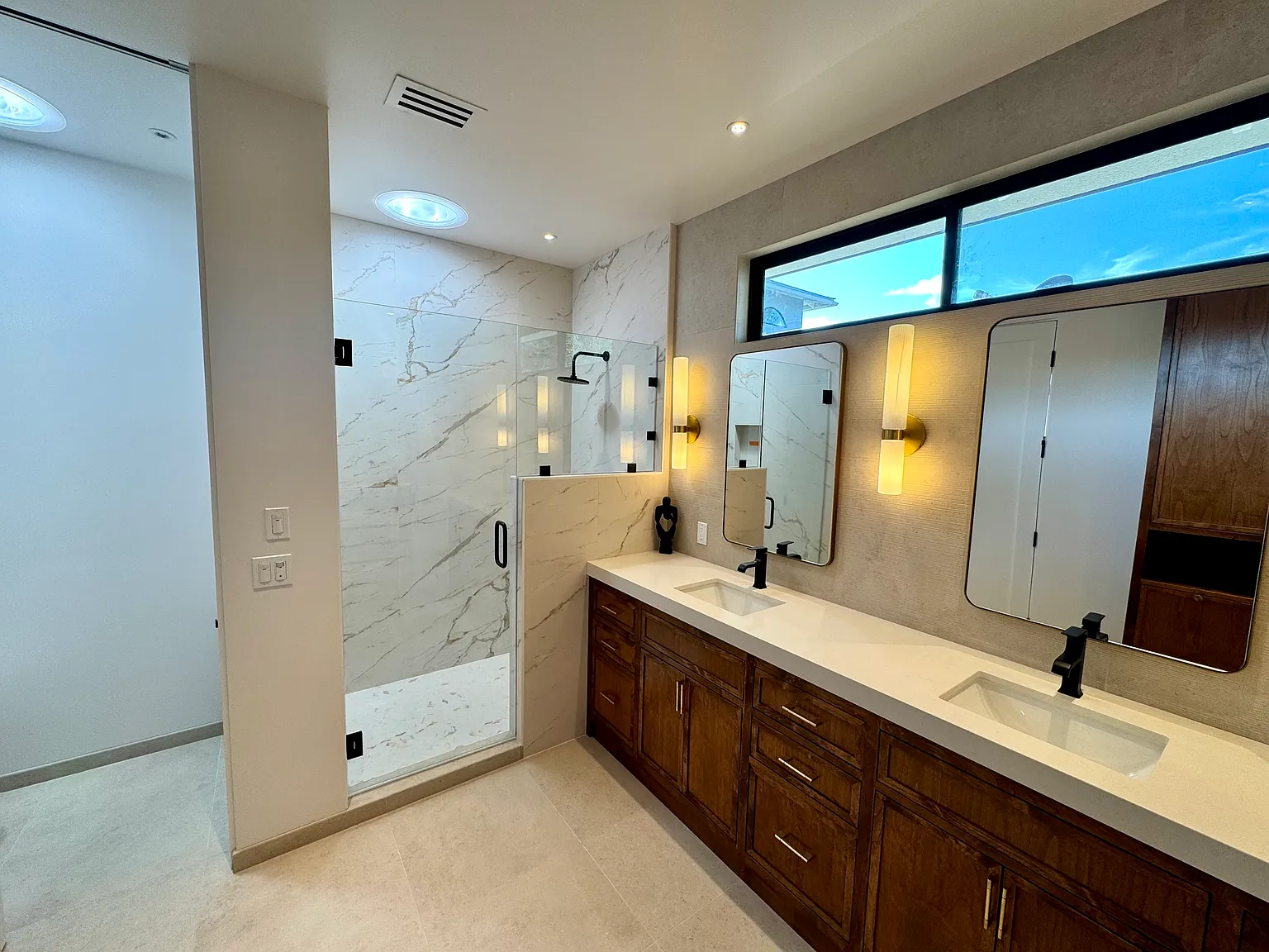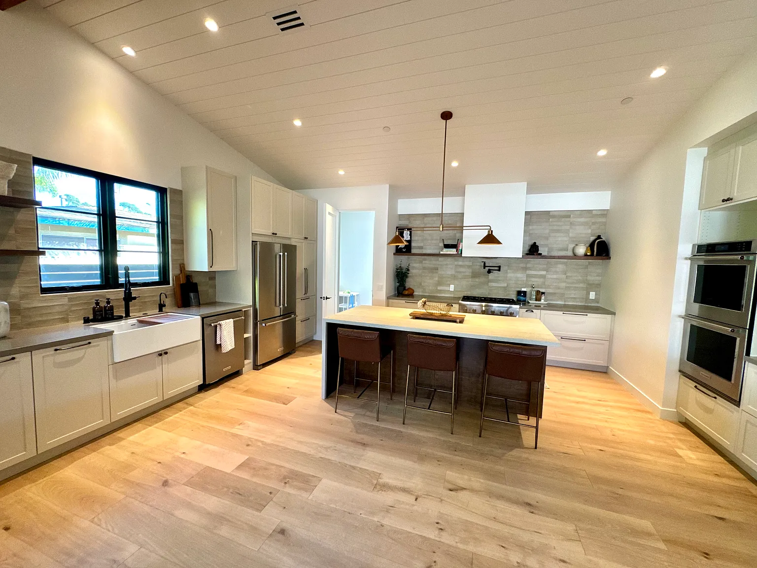 Designed with relaxation in mind, the home features three spacious bedrooms each with its own new en-suite bathroom, providing ultimate privacy and convenience. The primary suite offers a beautiful full glass door that opens directly to the patio, allowing you to enjoy peaceful mornings and easy access to the outdoor living space. All beds are outfitted with premium white down pillows and down comforters, along with Hotel Collection Egyptian cotton sheets, providing a comfortable, hotel-quality sleeping experience. Rich wood floors run throughout, complementing the refined details and thoughtfully curated furnishings.