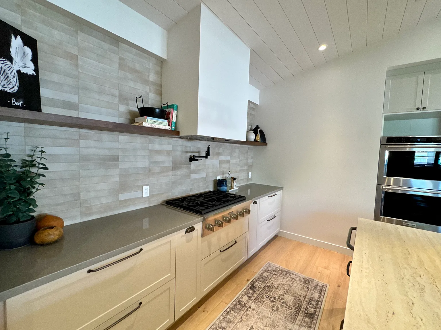 To the right, you’ll find the gourmet kitchen, a chefs dream showcasing custom cabinetry and an impressive suite of new, high-end appliances, including a wine refrigerator, microwave drawer, double oven, pot filler over the range, garbage disposal, and an instant hot water dispenser.