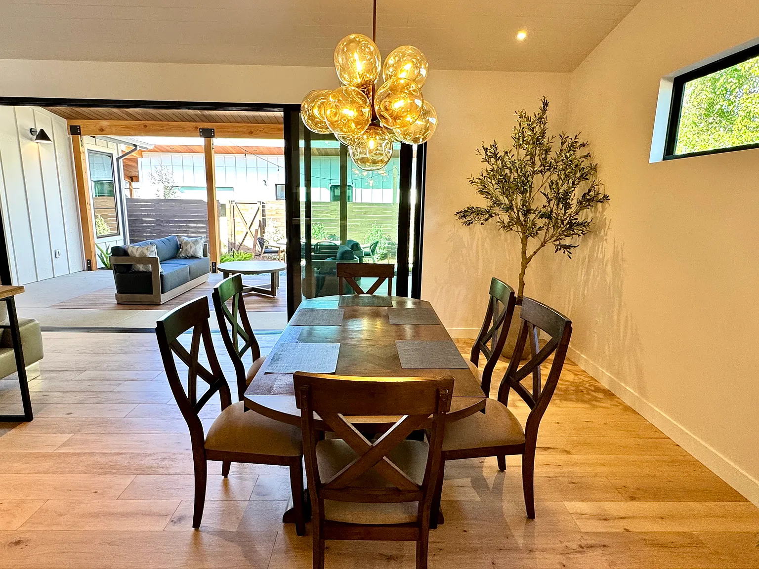Come inside to a spacious living room featuring a cozy fireplace and large glass sliding doors that open to the back patio, creating seamless indoor-outdoor living. The light-filled space is perfect for relaxing evenings or entertaining guests.